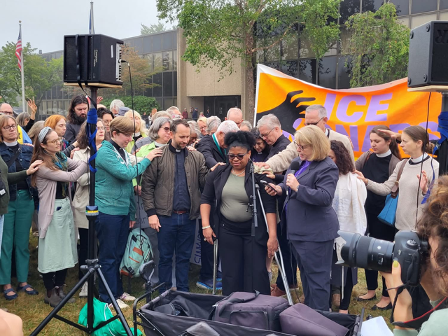 This video, taken by Rev. Ellie, documents Blanca walking on crutches into her hearing surrounded by Bishop Julia, her rector, her attorney, as well as political and community leaders. In a powerful embrace of emotional support, the crowd sang and prayed her into the building, and rejoiced when she came out later with good news: Blanca may remain in the US for a year and can resume her path to permanent citizenship.